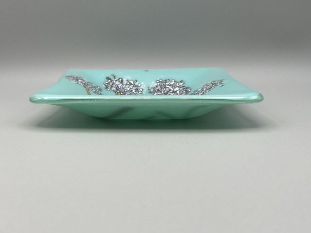 A unique stacked glass effect square dish in green and cream. Measuring approximately 15 cm square and 2 cm deep. This is a beautiful hand made piece with an organic look.