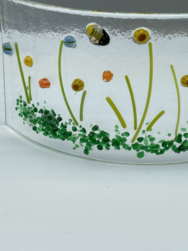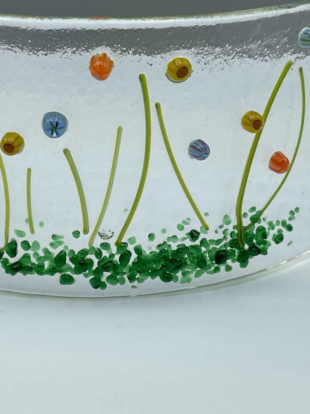 Floral glass fused curve measuring approximately 6 cm (h) x 12 cm )w) and 3.5 cm (d). created on clear glass using floral murine, This item is unique and handcrafted; please note that colour and size may vary slightly. The formation created from slumping may not be uniform. Colours may not be accurately reflected in the images.