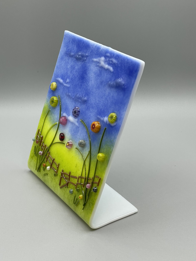 Freestanding fused glass countryside landscape broken gate