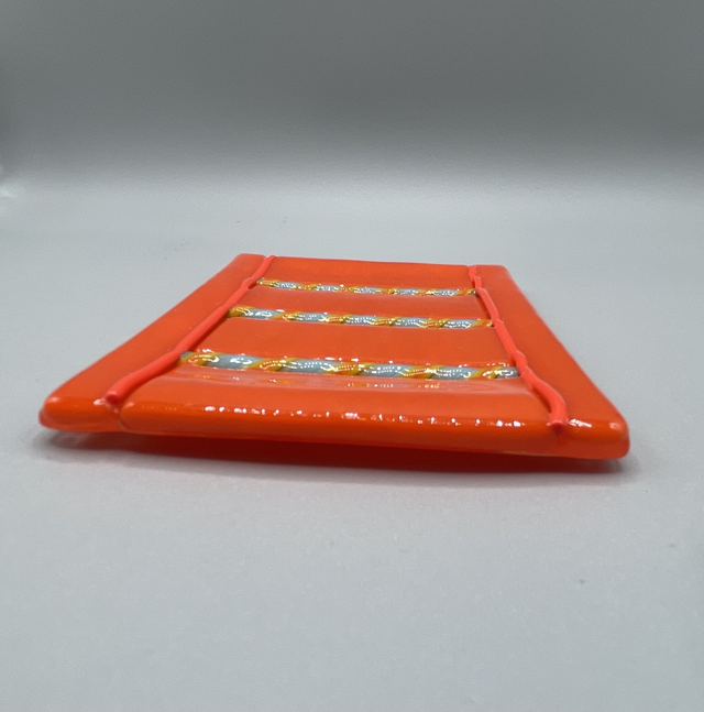 A one off orange and blue soap dish. This item can be made to order in a selection of colours to suit your requirements. This item is unique and handcrafted; please note that colour and size may vary slightly. The formation created from slumping may not be uniform. Colours may not be accurately reflected in the images.
