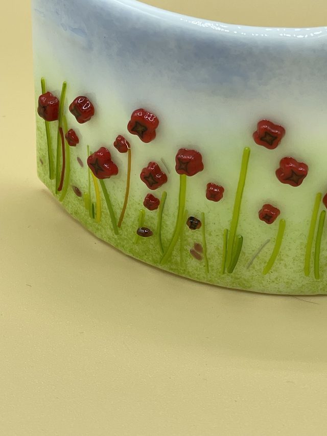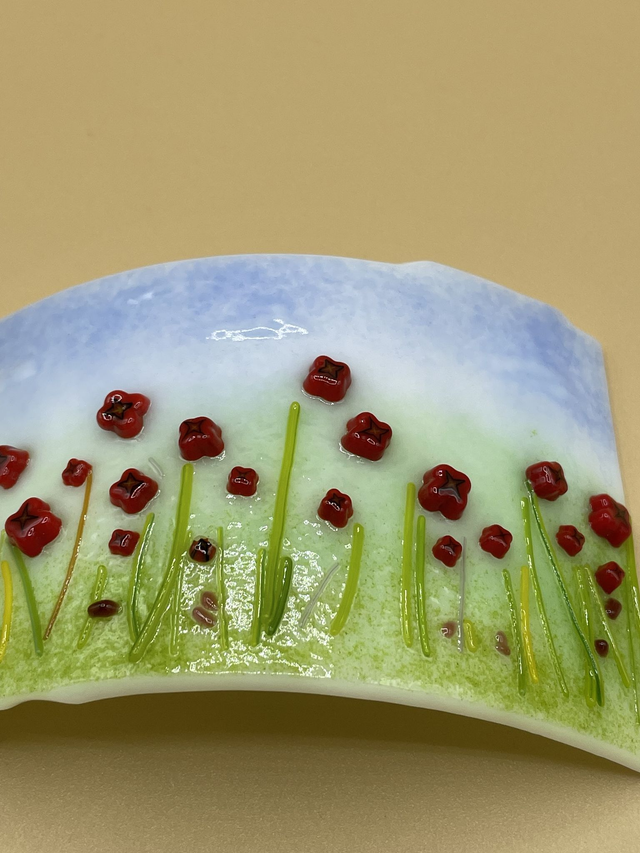Poppy Field - fused glass curve measuring approximately 6.5-7 cm (h) x 10 cm (w) and 2 cm (d). Created on white opal glass using floral murine, This item is unique and handcrafted; please note that colour and size may vary slightly. The formation created from slumping may not be uniform. Colours may not be accurately reflected in the images.