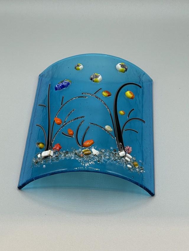 A unique tropical fish underwater scene on turquoise transparent glass shaped into a free standing curve. Measuring approximately 13.5 cm (h) by 11.5 cm (w)., with a depth of approximately 4.5 cm. This item is unique and handcrafted; please note that colour and size may vary slightly. The formation created from slumping may not be uniform. Colours may not be accurately reflected in the images.