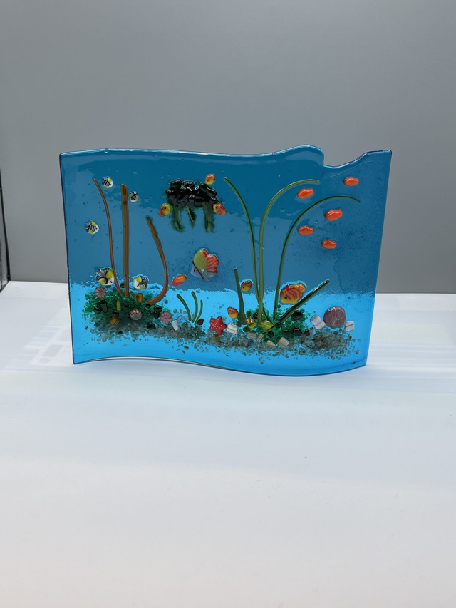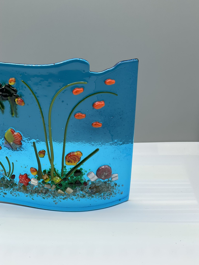 A unique tropical fish underwater scene on turquoise transparent glass shaped into a free standing wave. This items makes use of the rolled edge of Bullseye galss.